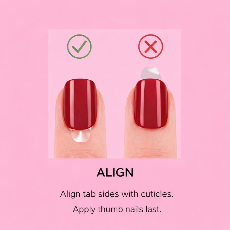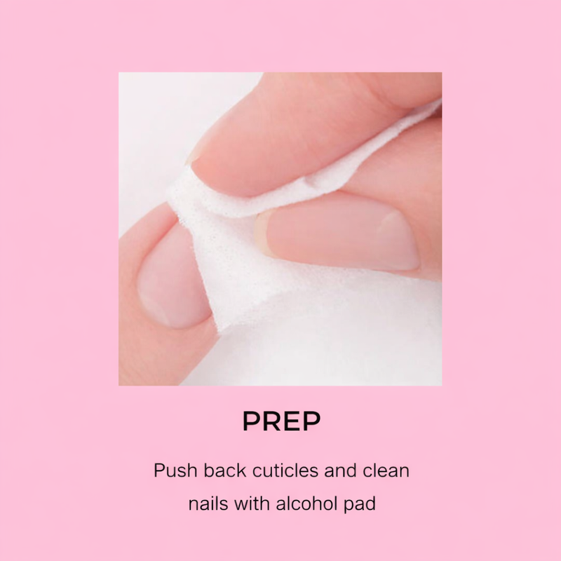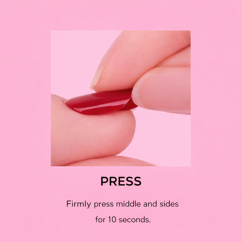 Pressy nails are made with pre-cured salon-quality gel and feature a built-in adhesive. Simply size your nails, peel off the adhesive backing, and press onto your natural nail. No glue. No UV lamp. No drying time. Two minutes on. Done.